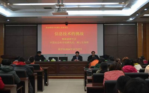 12月27日上午,商学院邀请中国社会科学院研究员、博士生导师荆林波在第三会议室作题为“信息技术的挑战”的学术报告。校党委副书记、校长纪良纲出席,100余名师生聆听了报告。报告会由商学院院长王小平主持。
