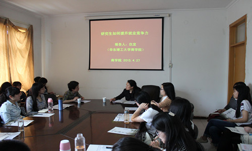 4月27日,华东理工大学商学院研究生教育管理中心主任仇宜应商学院邀请,在商学院西会议室作了题为“研究生如何提升就业竞争力”的报告。报告会由商学院副院长戎素云主持,学院部分教师及研究生参加了报告会。