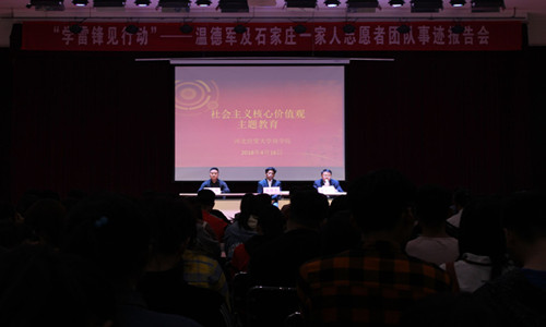 4月16日下午,商学院在大学生活动中心3号厅举办了"社会主义核心价值观"主题教育活动。邀请河北省劳动模范、河北十大感动人物、石家庄“一家人”志愿者协会会长温德军先生和河北金峻集团董事长、石家庄“一家人”志愿者协会副会长王凤爽先生作“学雷锋见行动”主题报告。学院师生党员、入党积极分、团员代表共计400余人参加。活动由学院党委副书记董爱民主持。