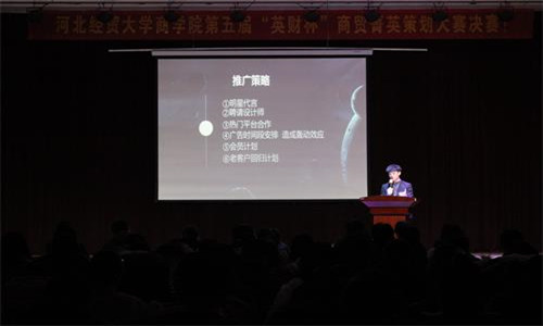 11月27 日晚,商学院在大学生活动中心三号厅举办第五届“英财杯”商贸菁英策划大赛。邀请了北京果益文化创意公司董事长曹思琪,天使投资财务顾问孟雨,天职会计师事务所经理贾斌担任评委。共来自商学院、会计学院、工商管理学院、金融学院的10支队伍进入决赛,商学院200余学生现场观摩。