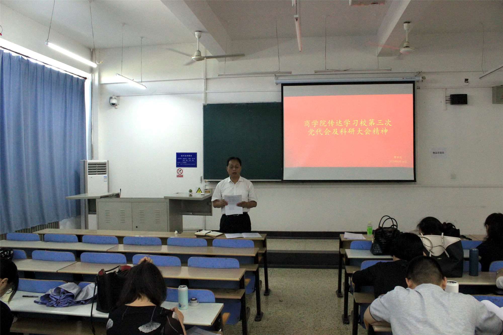 第三次党代会上的报告及会议精神,特别解读了大会提出的“一个目标、三大战略、六个注重、九大任务”及“夯基础、强内涵、拓格局、上层次”的工作思路。为深入学习好、贯彻好、落实好党代会精神,他提出三点要求:一要认真学习领会学校第三次党代会精神,深刻理解党代会的精神实质和核心内涵,全面推动学院各项工作再上台阶;二要进一步提高站位,凝聚共识,勠力同心,以时不我待的精神全面开启二次创业新征程;三要坚持以党代会精神为指导,不断深化改革,理顺机制体制,完善各项制度,凝聚智慧力量,推动学院双一流建设和内涵式发展全面提质增速。