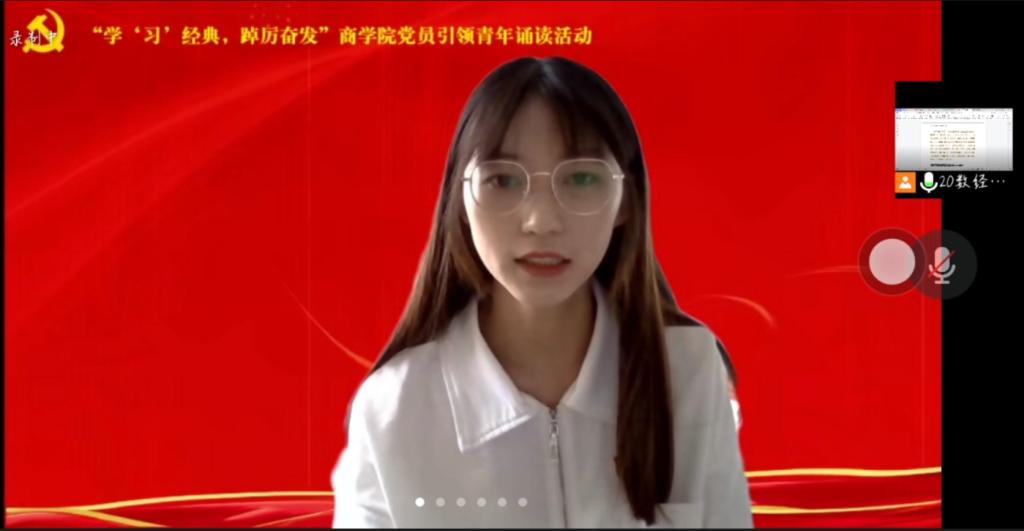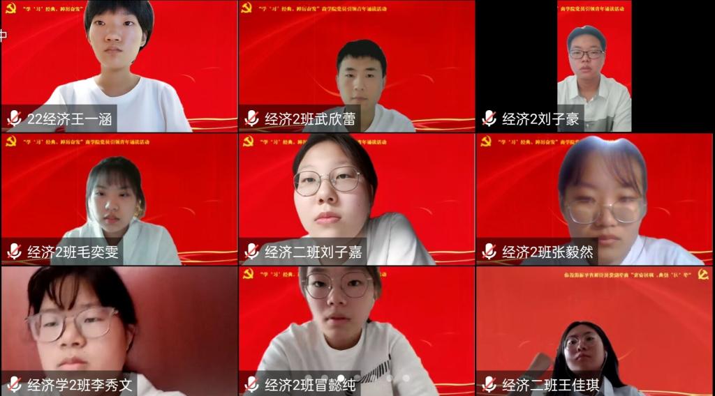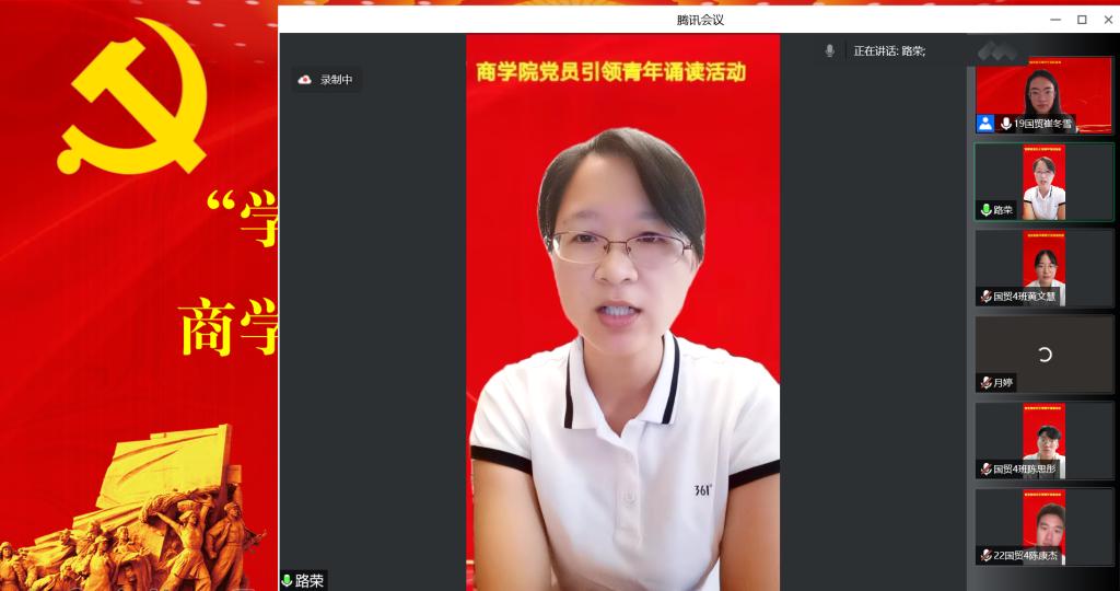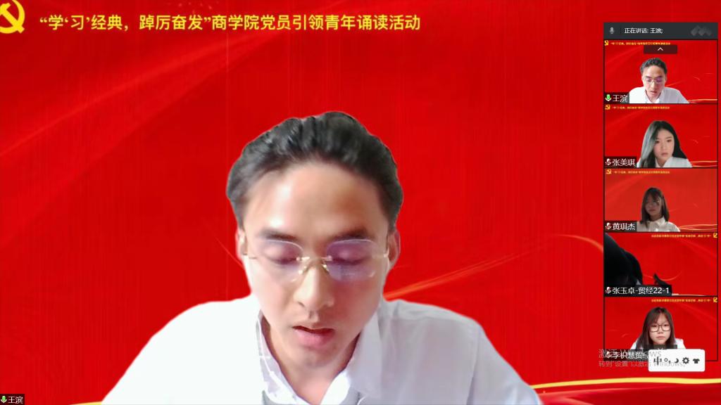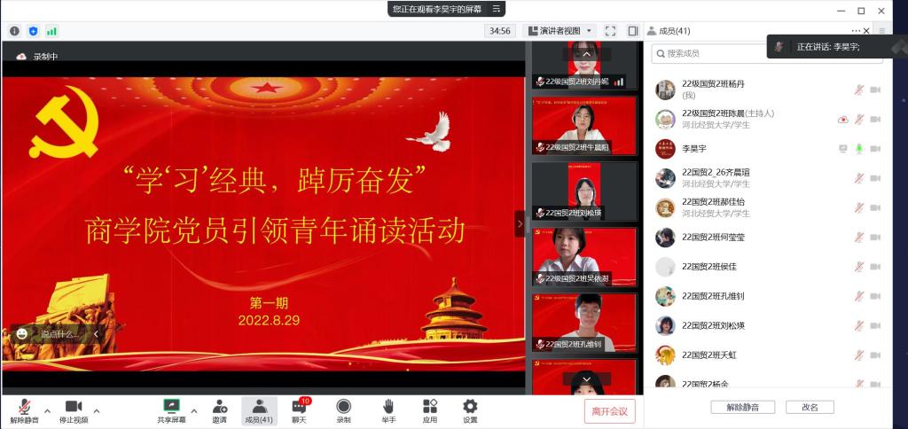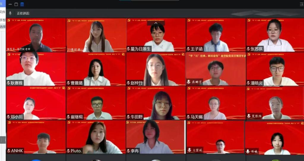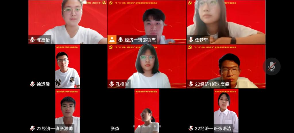 8月29日下午,商学院在线上举办“学‘习’经典,踔厉奋发”党员引领青年诵读活动,学院2022级新生辅导员、10名优秀学生党员代表和2022级全体新生参加了此次活动。