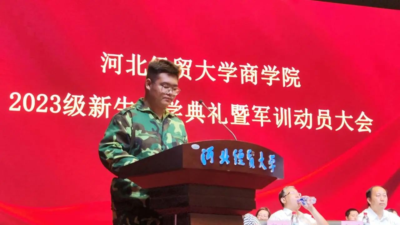 2023级经济学3班韩昀辰作为新生代表发言。他表示,与高中不同,大学要靠自己去探索未来,要自信、自立、自强,遵规守纪,保持勤学好问的好习惯,积极在即将到来的军训课堂中锤炼自己,用实际行动让青春无悔,做全面发展的新时代大学生。