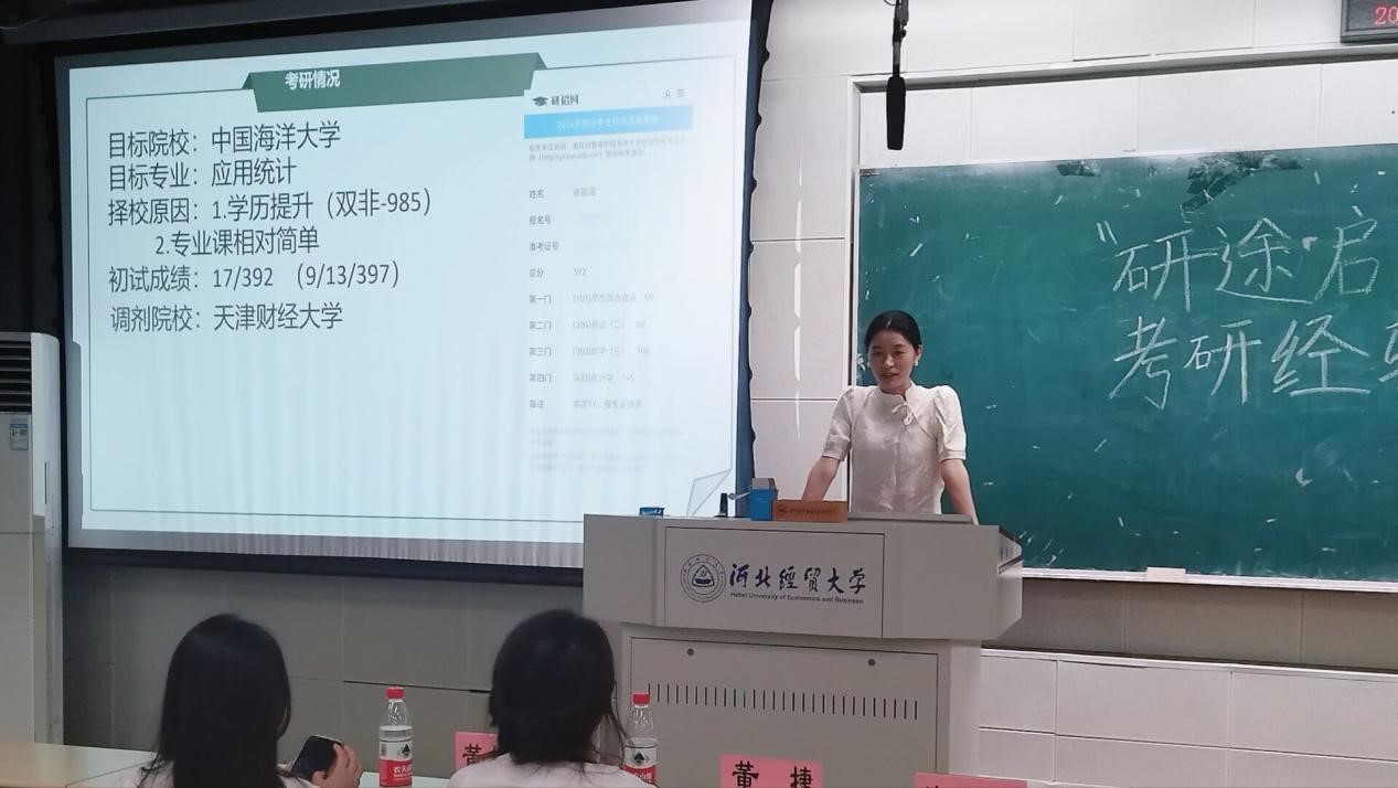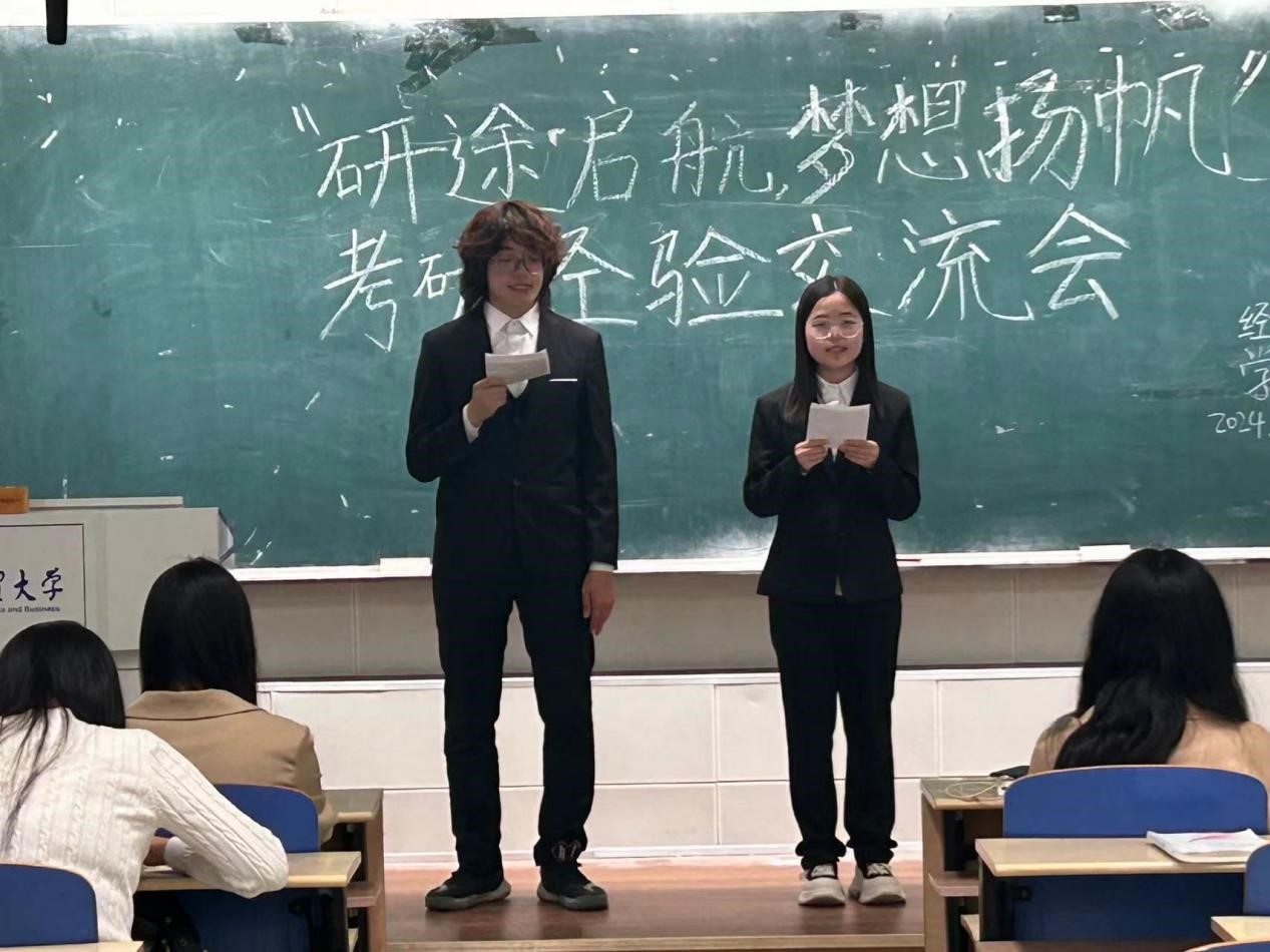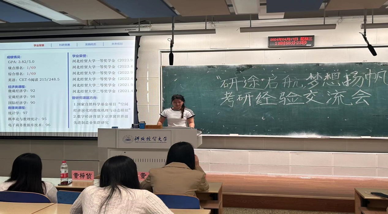 在北三教A101举办了以“研途启航,梦想扬帆”为主题的考研经验交流会。出席本次考研经验交流会的有赵思彤、张筱萌、董捷、董梓侦、张晨涵五位优秀学姐。本次考研经验交流会由宋华志、张冰燕主持。