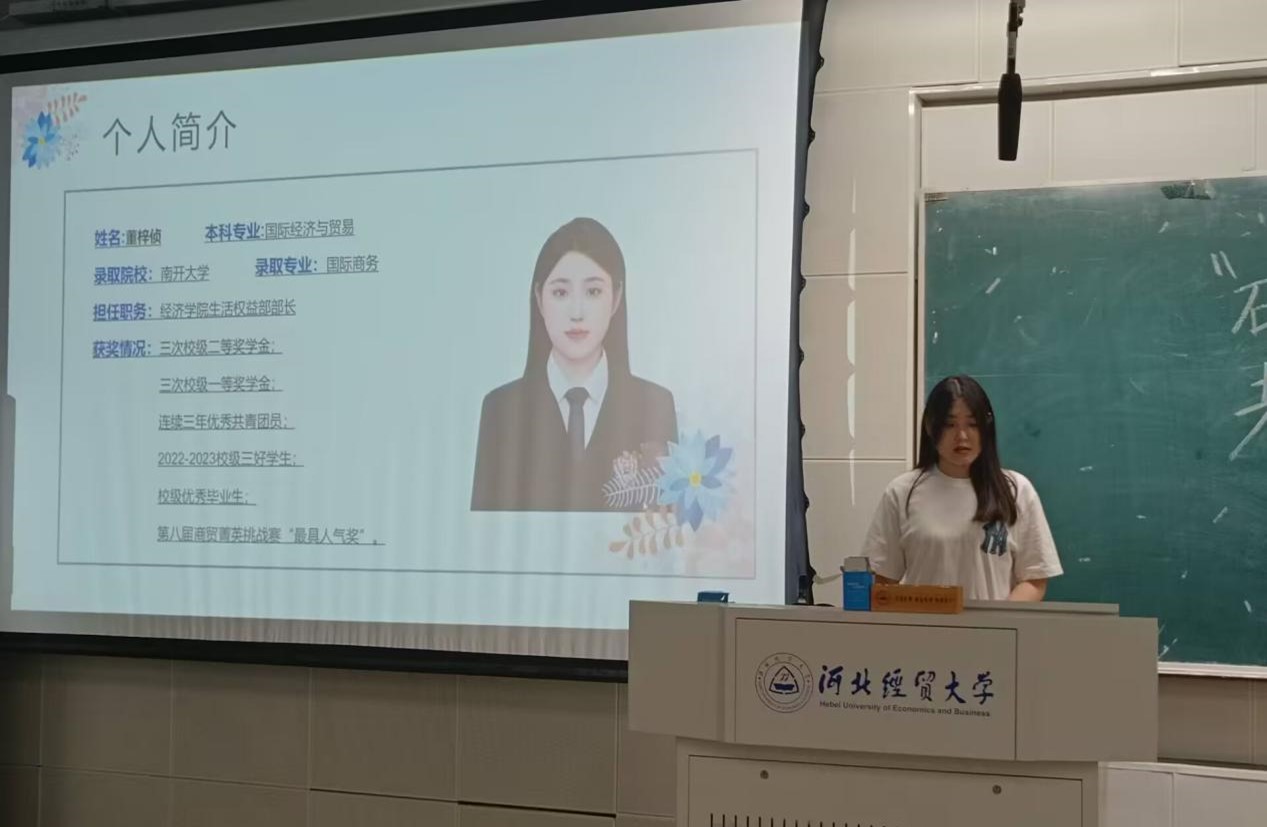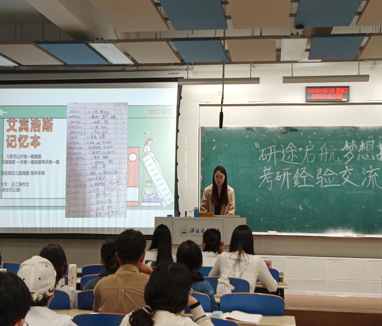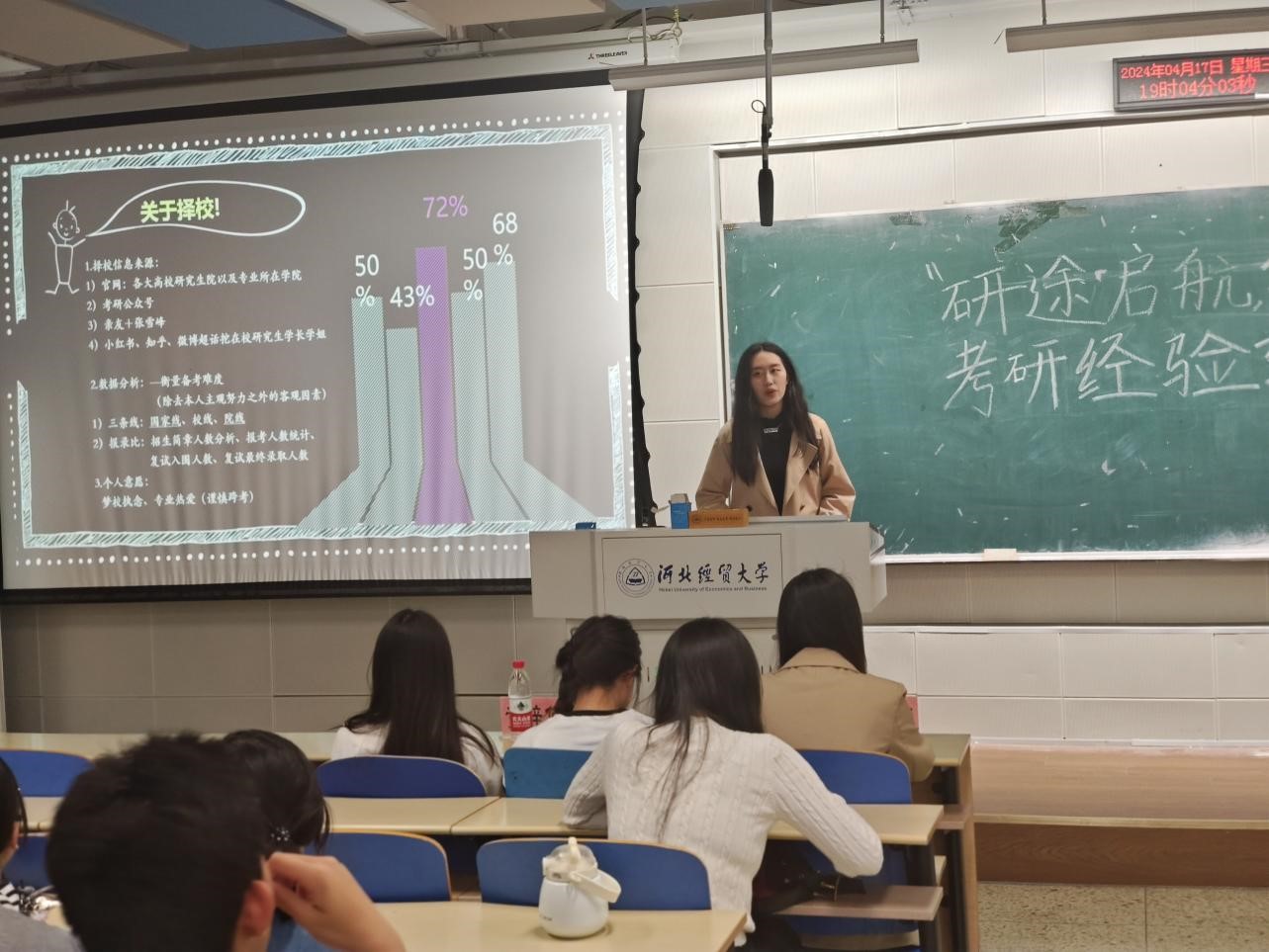 在北三教A101举办了以“研途启航,梦想扬帆”为主题的考研经验交流会。出席本次考研经验交流会的有赵思彤、张筱萌、董捷、董梓侦、张晨涵五位优秀学姐。本次考研经验交流会由宋华志、张冰燕主持。