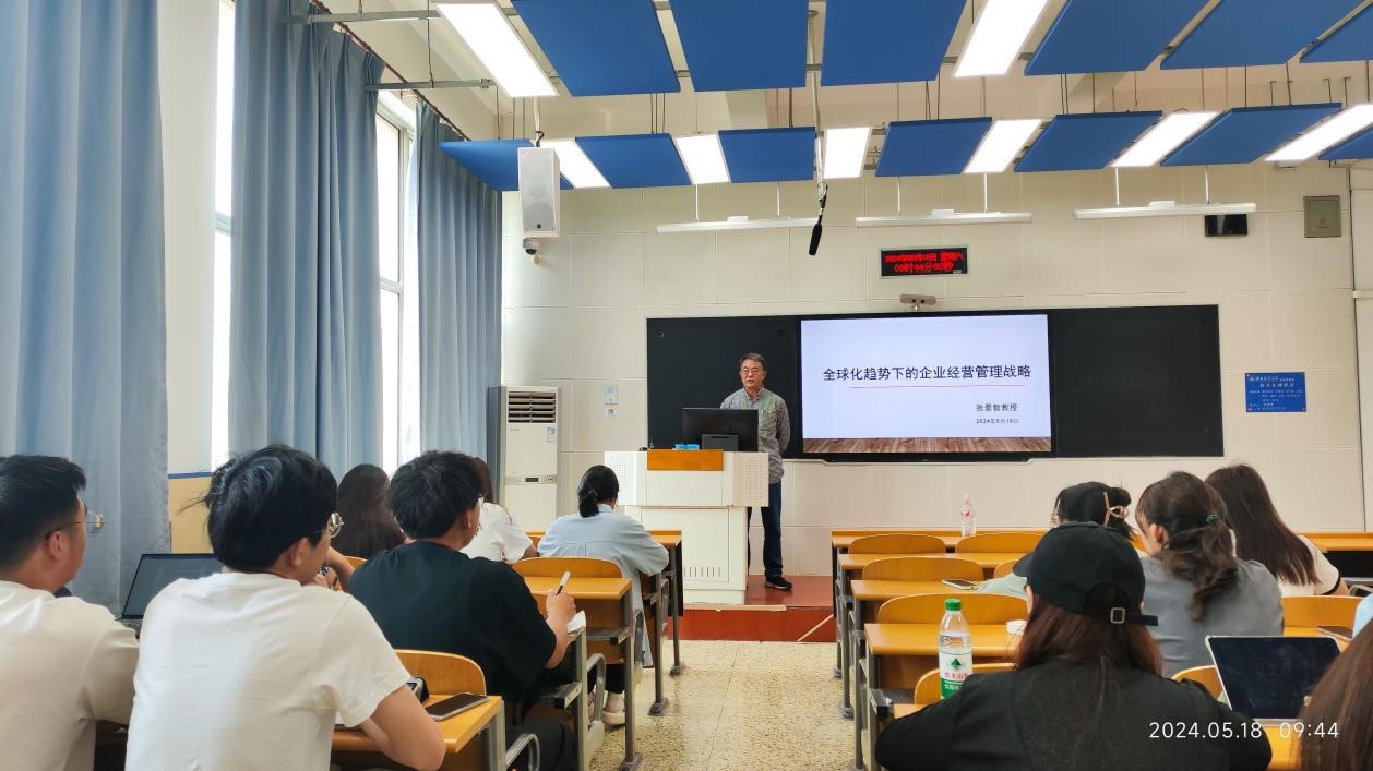 邀请知名校友、德国路德维希国际公司董事局顾问张景智先生为23级国际商务专硕研究生作了题为“全球化趋势下企业经营管理战略”的报告。报告由国际商务专硕导师组组长高云龙副教授主持。