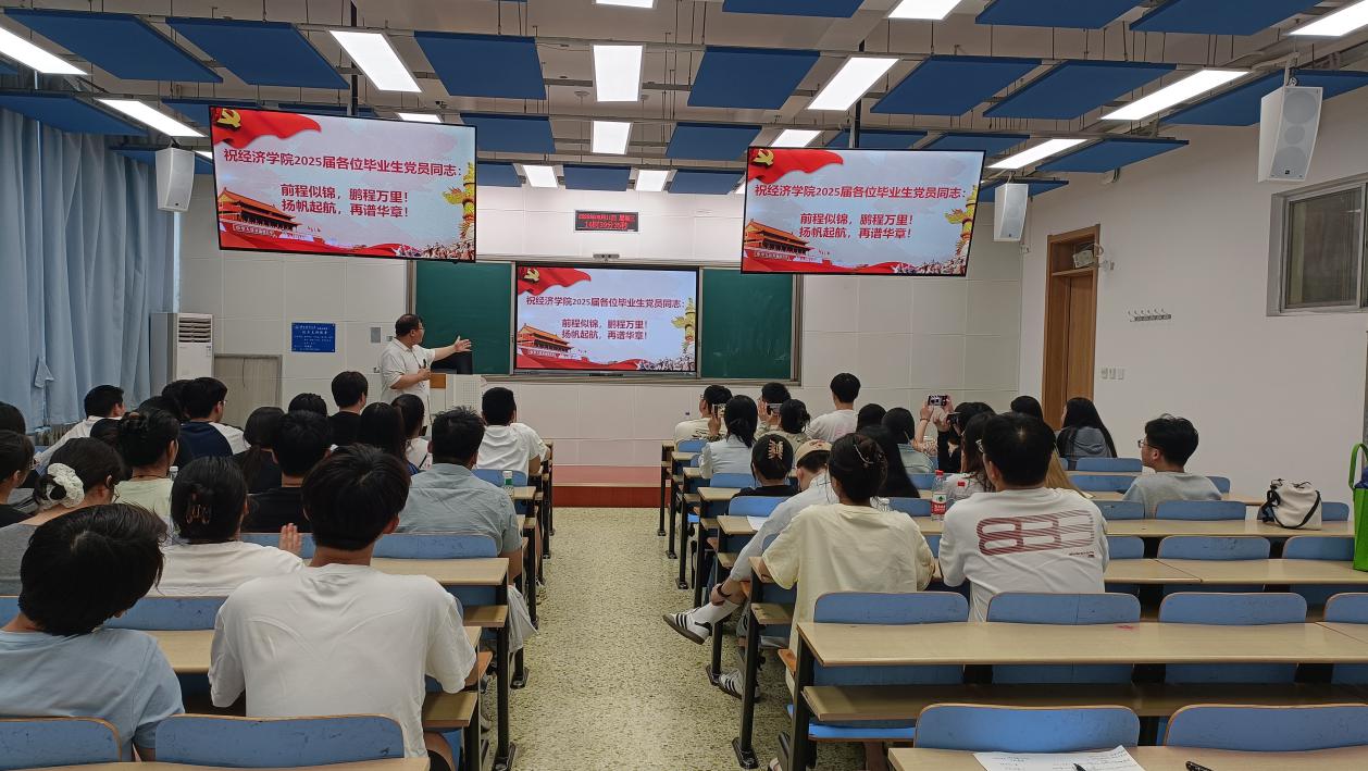 2025届毕业生党员的最后一课”为题,向毕业生党员讲授党课。他从筑牢信仰之基:坚定理想信念,践行经济报国使命;锤炼能力之翼:提升专业能力,勇做时代建设者;严守纪律之尺:恪守纪律规矩,传承优良作风;永葆感恩之心:牢记宗旨,践行服务人民使命等四个方面进行深入讲解。并向毕业生党员提出四点殷切嘱托,希望大家始终旗帜鲜明讲政治,做理想信念的“坚守着”;始终如饥似渴强本领,做伟大事业的“实干家”;始终心存敬畏守底线,做清正廉洁的“明白人”;始终饮水思源葆初心,做服务人民的“勤务员”。