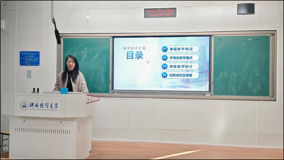 郎郸妮老师针对国际经济学教学提出优化方案。她指出当前教学存在学生知识碎片化、学习热情不足的问题,明确将从三方面改进:一是持续丰富教学资源,目前已完成五项资源建设,为比赛展示提供支撑;二是设计多样化考核方式,将学生注意力转移到平时课堂,激发自主学习热情;三是深化技术融合,持续开发AI功能辅助教学,同时融入课程思政,帮助学生构建中国制度自信。