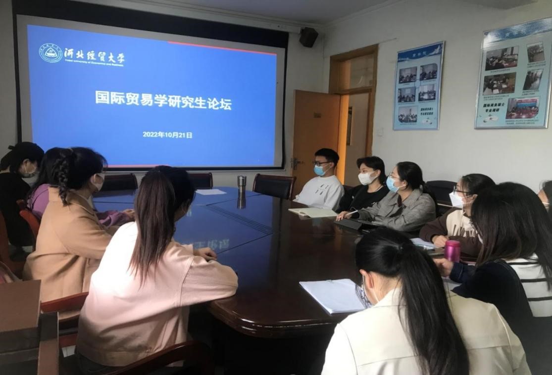 2022年10月21日下午,商学院国际贸易学专业2021-2022级全体学生在第三办公楼405室举办了主题为“国际贸易学研究生论坛”的学术沙龙,活动内容主要是由研二学生进行学术汇报和论文写作的经验分享,研一学生参与聆听并学习。