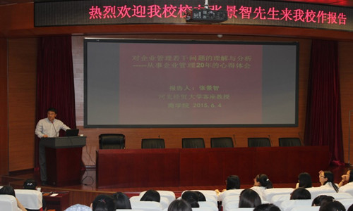 校友张景智应邀在国际学术报告厅作题为“对企业管理若干问题的理解与分析”的讲座。讲座由商学院副院长焦知岳主持,共有300余名师生聆听。