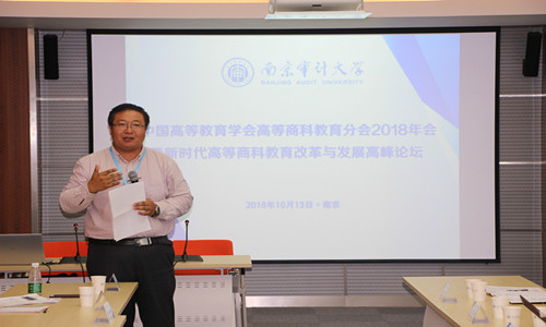 2018年10月13日上午,“中国高等教育学会高等商科教育分会2018年会暨新时代中国高等商科教育改革与发展高峰论坛”在南京审计大学中和楼隆重召开。来自中国人民大学、兰州财经大学、中央财经大学、山西财经大学、浙江财经大学等三十余所高校的商科教育领域的专家、院长、学者参加了本次论坛,我院刘振滨副院长参加了此次会议。