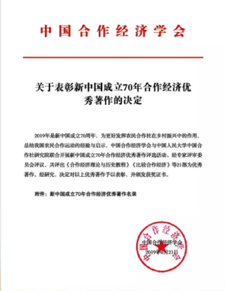 会议首先由中国合作经济学会会长孙中华致欢迎词,接着对新中国成立70年合作经济优秀著作和农民合作社与农业农村优先发展学术研讨优秀征文活动中评选出的获奖代表进行表彰。经专家评审委员会评议,共评出《合作经济理论与历史教程》《合作社真谛》等21部为优秀著作。我院马彦丽教授专著《我国农民专业合作社的制度解析》(中国社科出版社2007年版)入选。