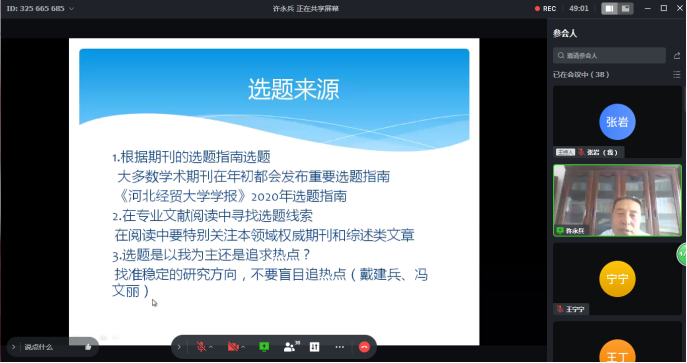 学报编辑部主任许永兵教授应商学院邀请,于线上作了题为“经济学论文的选题与写作问题”的学术报告。报告由刘振滨副院长主持。学院30余名师生参加。