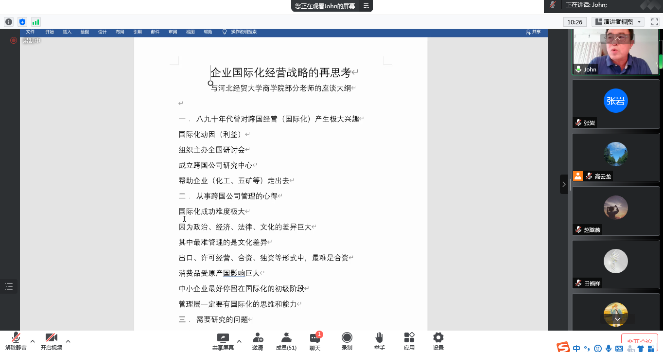 6月18日,德国路德维希国际公司董事局顾问张景智应商学院邀请,于线上作了题为“企业国际化经营战略的再思考”的学术报告。报告由高云龙副教授主持,学院五十余名师生参加。