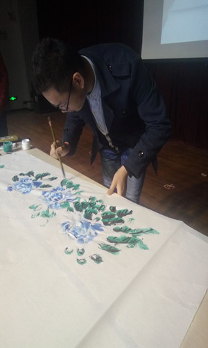 才艺交流会中,表演同学纷纷展示出精心准备的各类节目。欢快甜美的吉他弹唱“虫儿飞”,幽默风趣的相声表演“我的大学生活”等,各式各样的才艺表演不时引起台下观众的掌声喝彩。其中,2016级国际经济与贸易6班的刘贺龙带来的现场作画《牡丹图》赢得大家热烈掌声,几朵牡丹跃然纸上,令观众耳目一新、为之赞叹。最后,活动以大合唱《没有共产党就没有新中国》圆满落下帷幕。