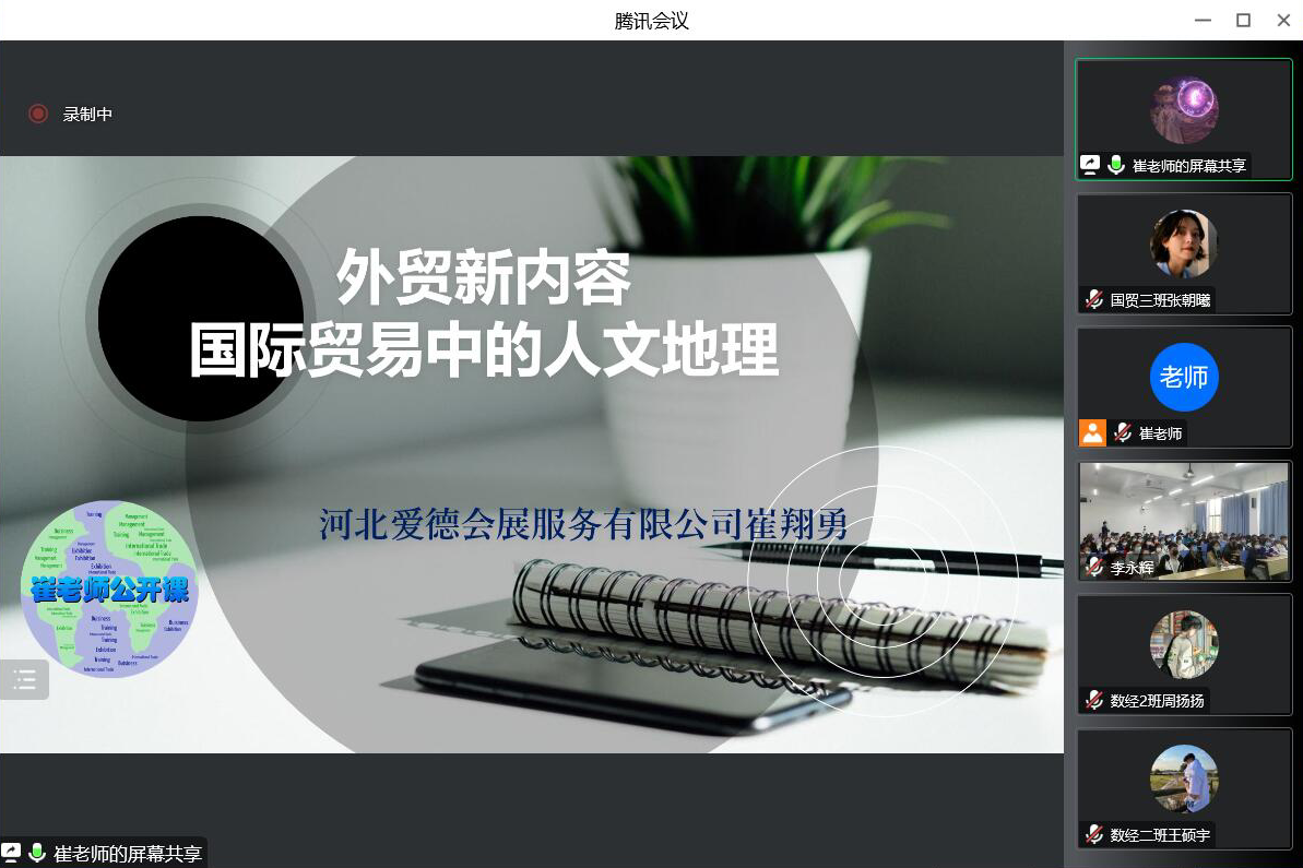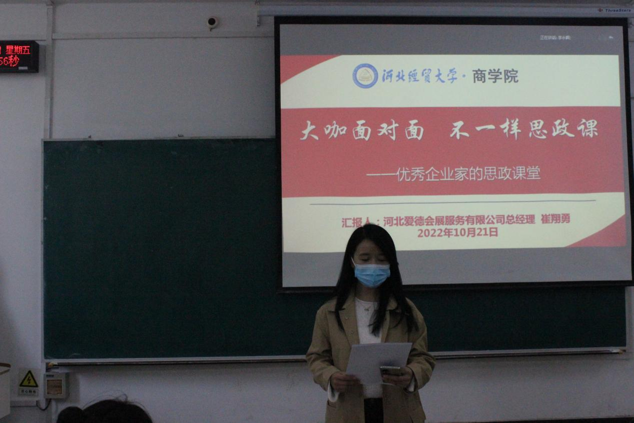 10月21日下午4点,商学院在北三教B202利用腾讯会议以线上线下相结合的方式举办了第三期“大咖面对面,不一样的思政课”校企合作和优秀校友的思政课堂活动。活动由河北爱德会展服务有限公司崔翔勇总经理主讲,商学院党委副书记侯彦利、商学院2022级经济1、2班的学生和线上数名学生参加本次活动。会议由商学院就业工作负责人李婷主持。