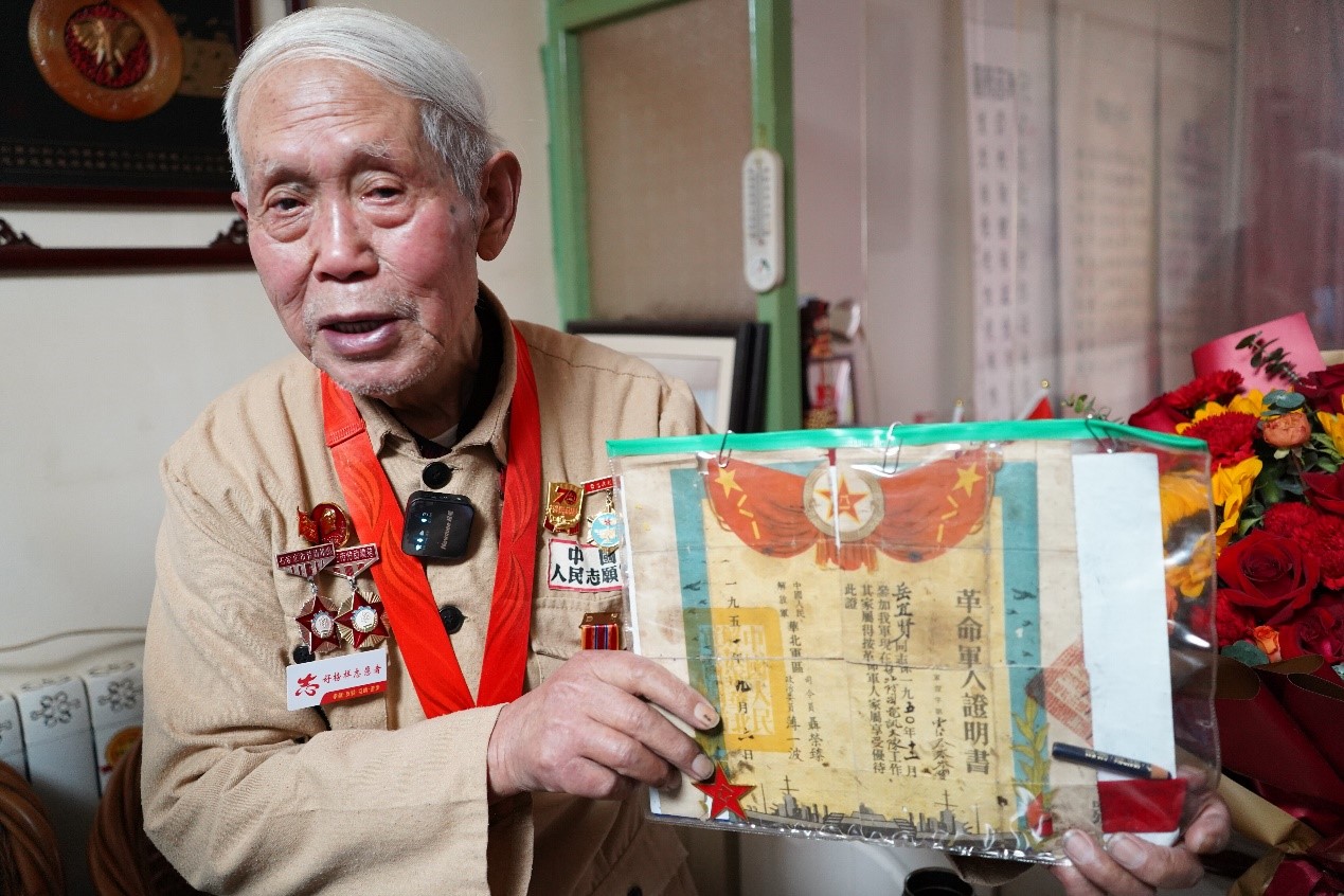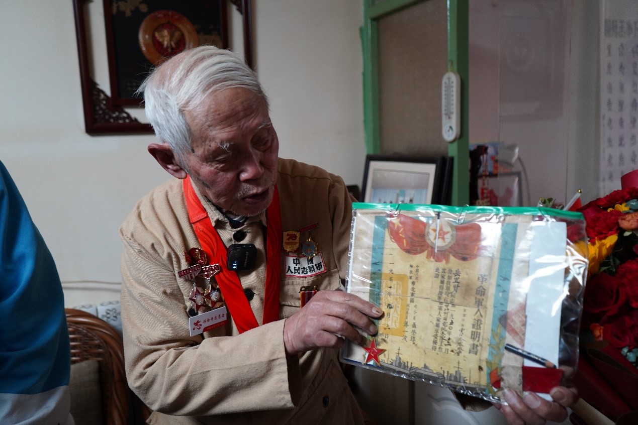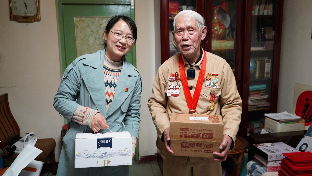 路荣为老战士送上慰问品,表达了后辈的敬意与慰问,老先生感动不已。