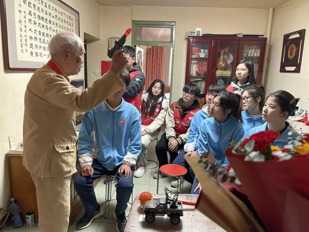 同学们围坐一起,静静聆听老战士讲述他作为雷达兵赴朝作战的故事。老先生回忆,敌机每天都在头顶盘旋,白天根本不敢前进,而雷达兵作为行军的“千里眼”、“顺风耳”,必须冲在队伍最前列,为指挥部提供敌机方位。硝烟弥漫,乱石飞炸,没有一个人退缩,每个人都时刻保持着战斗状态。