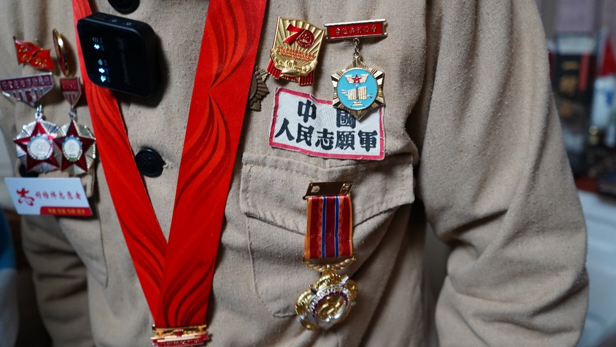 退伍军人张文婧为老人献上鲜花,年轻战士注视着老战士,时代的接力棒在他们的手中传递,保卫国家、建设国家的重任在他们手中交接。面对年轻战士,老先生激动不已,轻拍同学肩膀表示肯定;同学向老人敬礼,用行动表示她定不负所托。