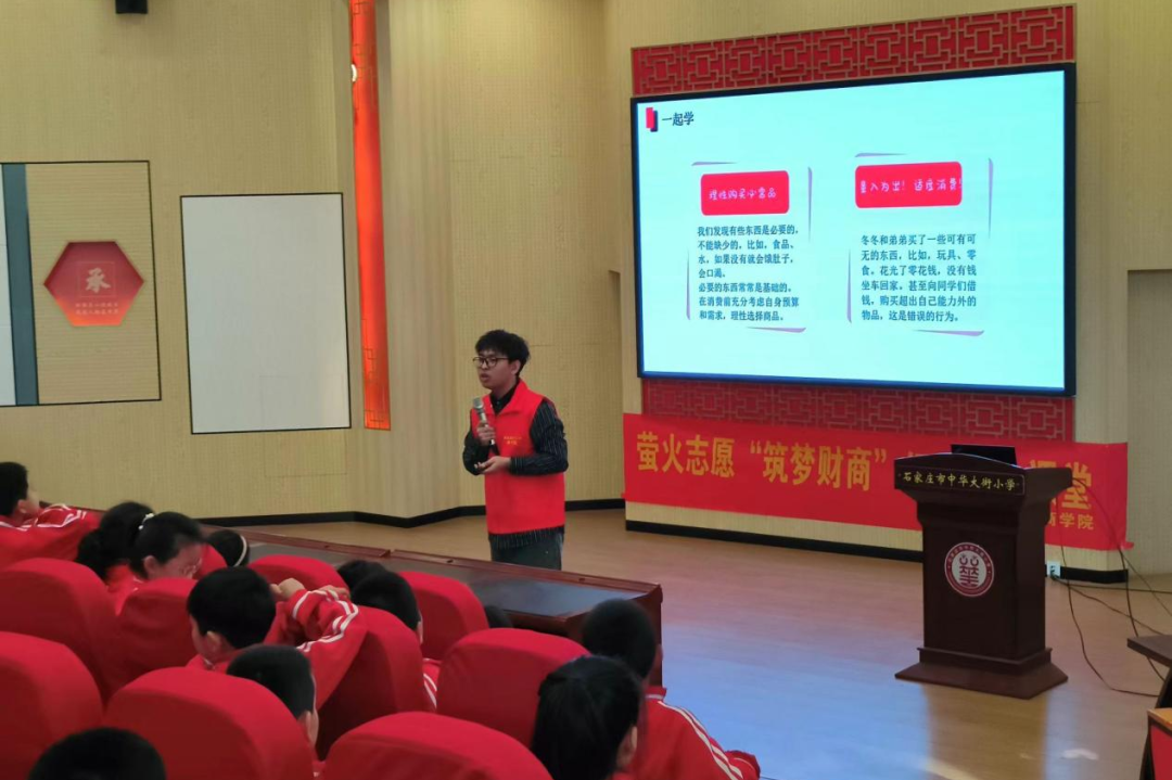 “筑梦财商”经济学小课堂作为“萤火”志愿服务项目中的特色活动之一,精心打造大学生主讲团队,为小学生讲授“财商思维培育”精品课程。课堂上,大学生用通俗易懂的语言,风趣幽默的授课方式,科学地向小学生讲授经济学常识,从而丰富小学生的财商知识储备,培养小学生理性消费、目标规划的意识与能力,助力其养成正确的劳动观、消费观和理财观,进而树立正确的人生观和价值观,筑牢勤劳、担当、勇毅等优秀品质。