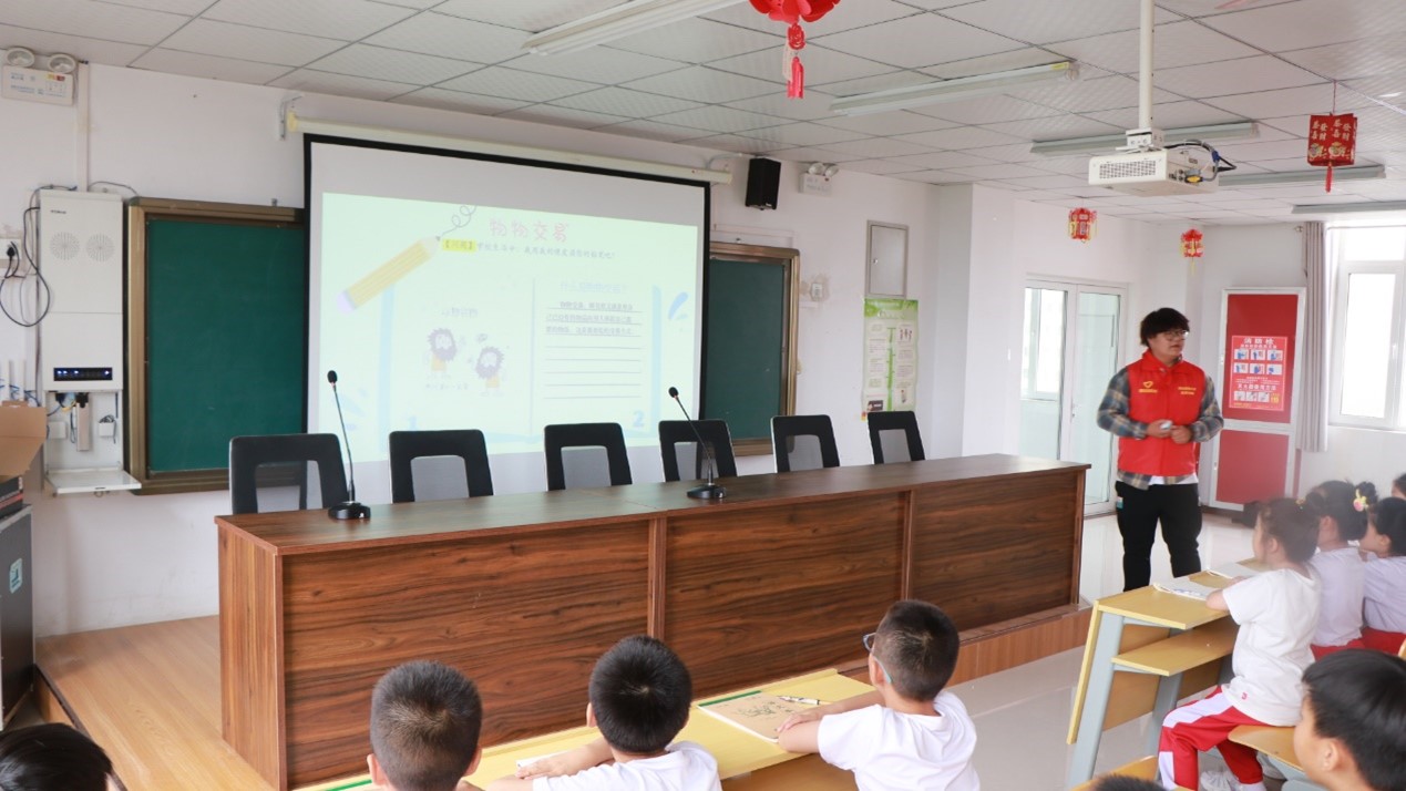 上课铃响,一百多双炯炯有神的眼睛齐齐望向了授课的志愿者,孩子们的眼睛中都充满了对知识的渴望。志愿者韩昀辰同学为孩子们讲述了货币的发展历程和如何树立正确的消费观,他用过硬的专业知识和生动的讲课方式为孩子们打开了经济学的大门。孩子们踊跃举手,积极地参与到课堂的互动环节,志愿者们也为回答问题的孩子们送上了小礼品。