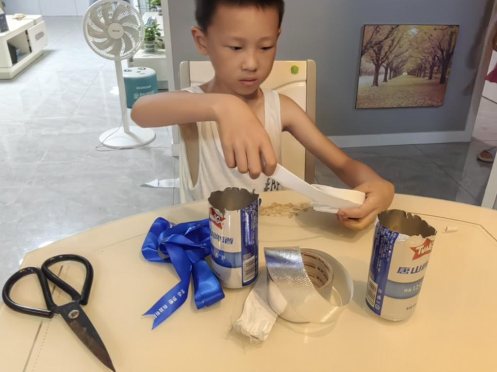 废物利用动手做:志愿者与小朋友们相互配合,让废旧物品变身为有价值的创意作品,不仅锻炼了小朋友的动手能力,也传递了环保意识。
